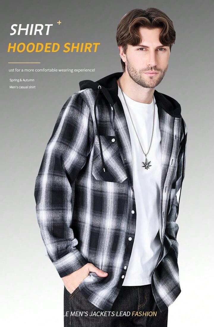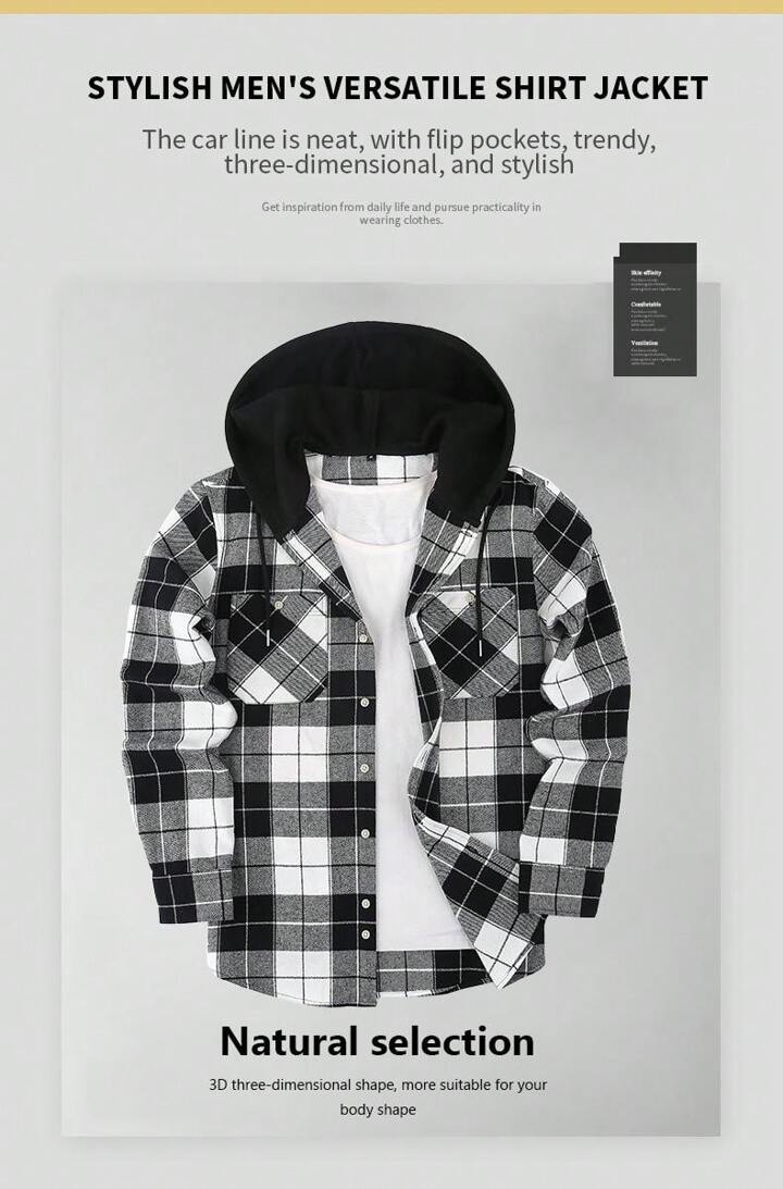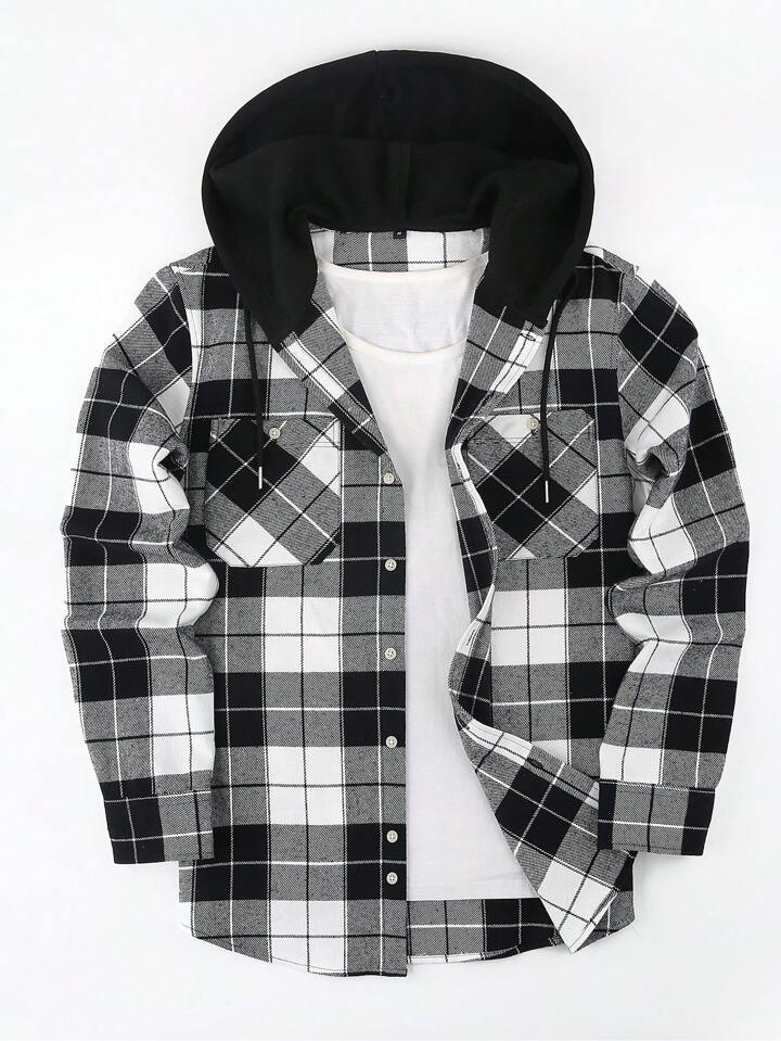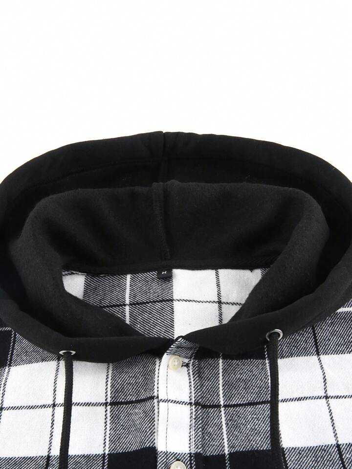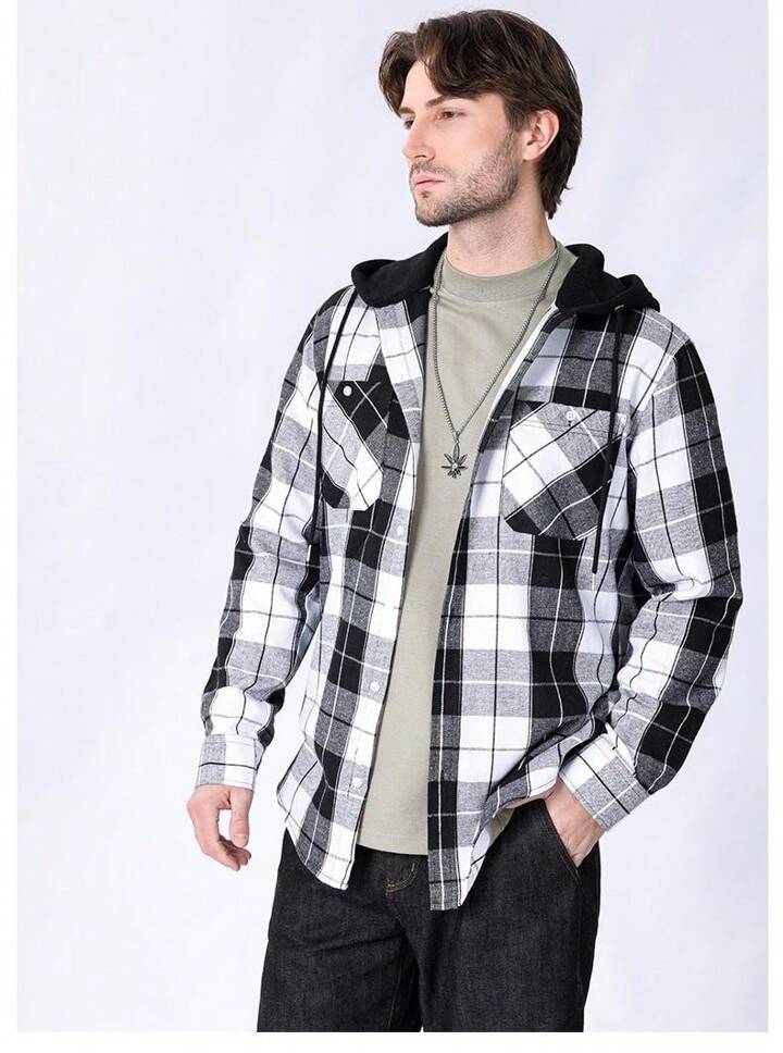1pc Men's Hooded Plaid Button Turndown Collar Regular Fit Long Sleeve Shirt, Chest Double Pockets Casual Outdoor Shacket